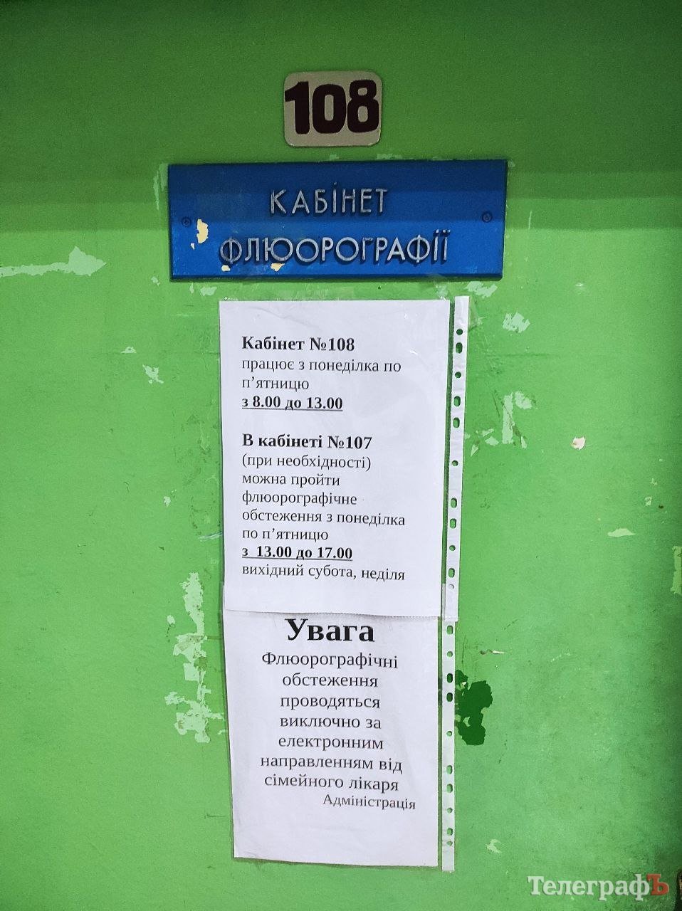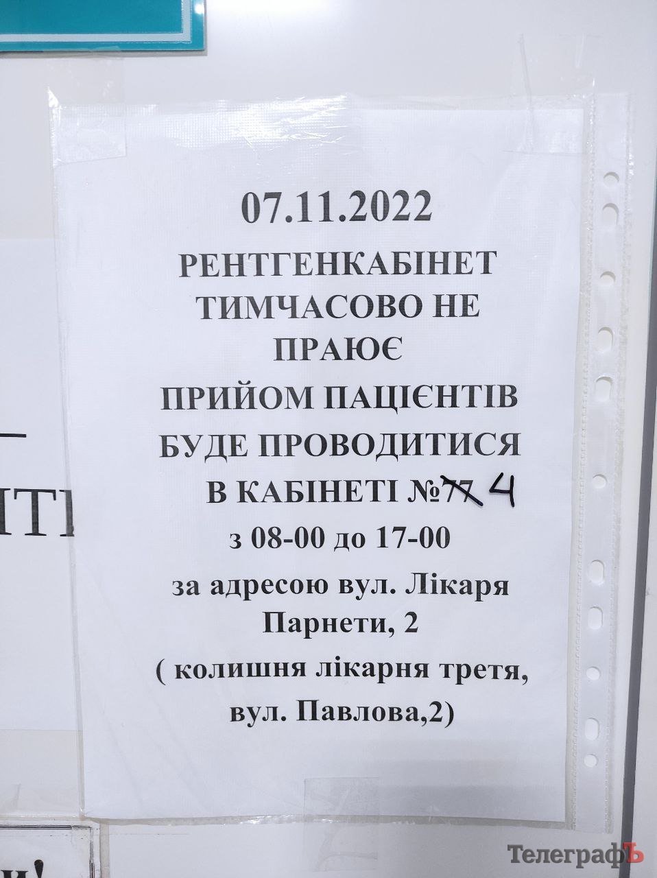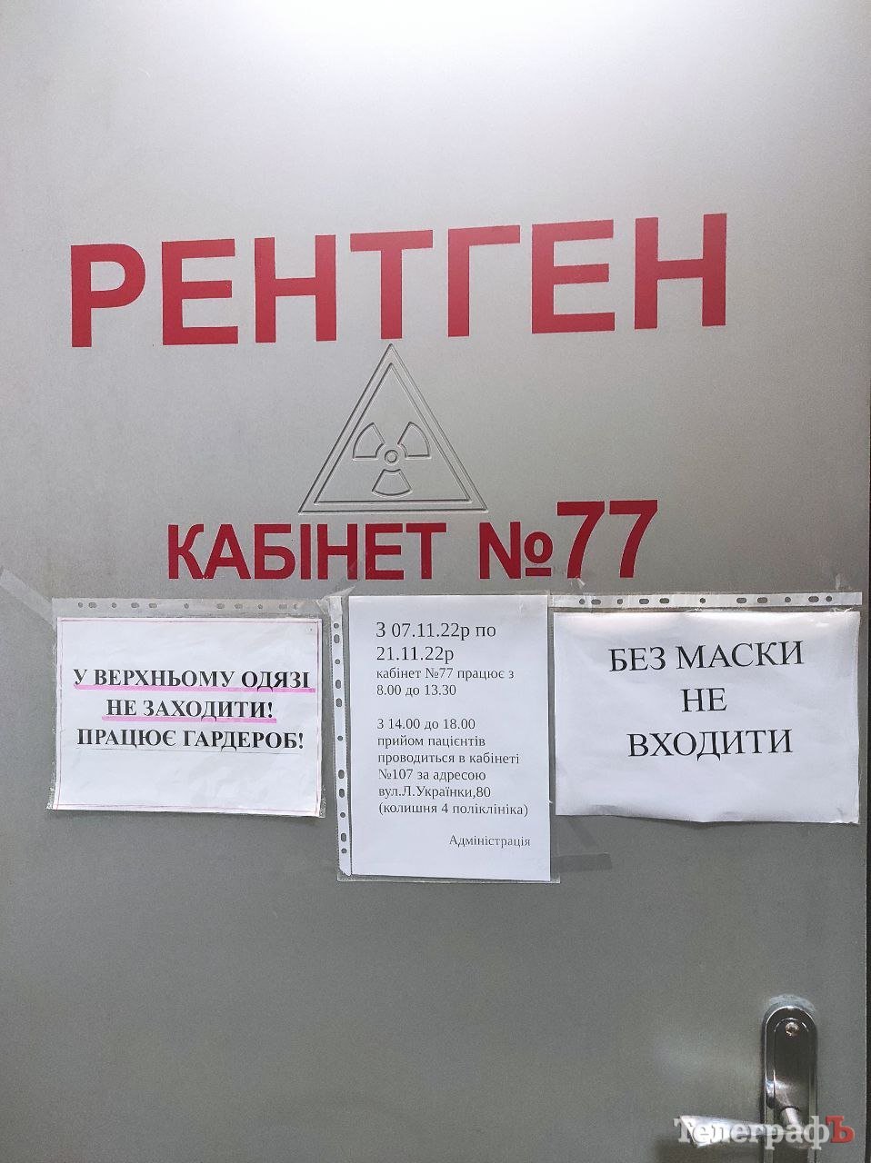 7 листопада рентгенкабінет №107 продовжує не працювати. Добре, що цього разу з’явилося оголошення для пацієнтів з розясненням, де кременчужани та вимушені переселенці можуть безоплатно зробити рентгенографію за електронним направленням у межах Програми медичних гарантій – у кабінеті №4 у приміщенні КНМП «ЛІЛ «Кременчуцька» на вул. Лікаря Парнети (колишня Павлова), 2.