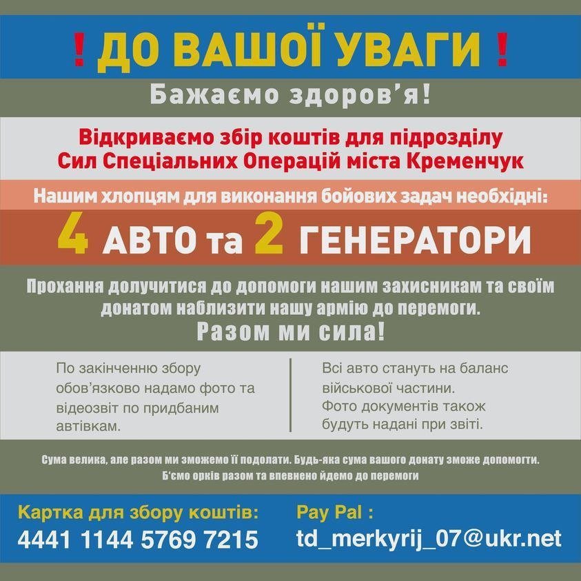 До редакції Телеграфу звернулися військові з підрозділу Сил спеціальних операцій. Нашим хлопцям для виконання бойових задач необхідні 4 автомобілі та 2 генератори.