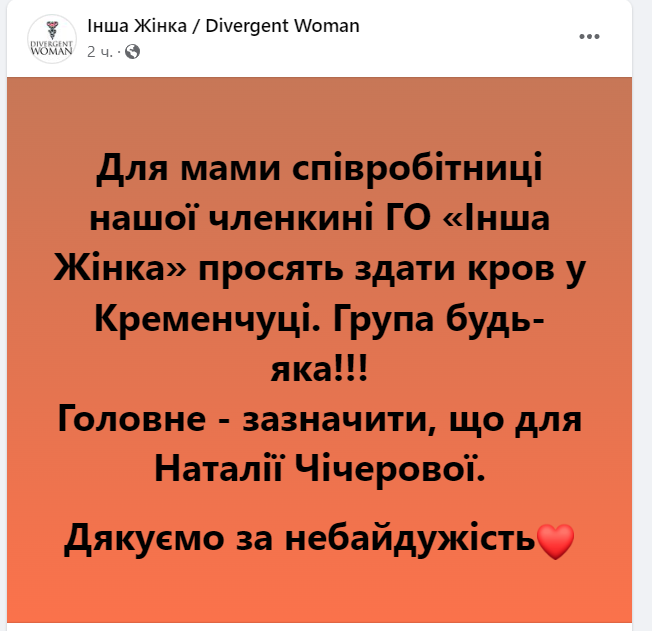 Зазначається, що піде будь-яка група крові, проте просять зазначити, що для Наталії Чічерової.