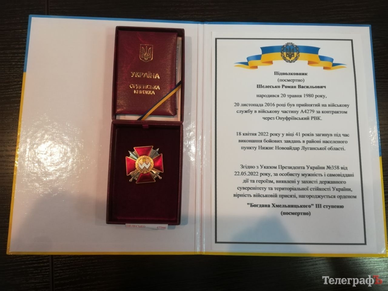 Сьогодні, 9-го листопада, начальник Кременчуцької районної військової адміністрації Олег Лєднік вручив орден «Богдана Хмельницького» ІІІ ступеню, яким був нагороджений полеглий захисник України підполковник Роман Шелесько, його дружині та дітям.