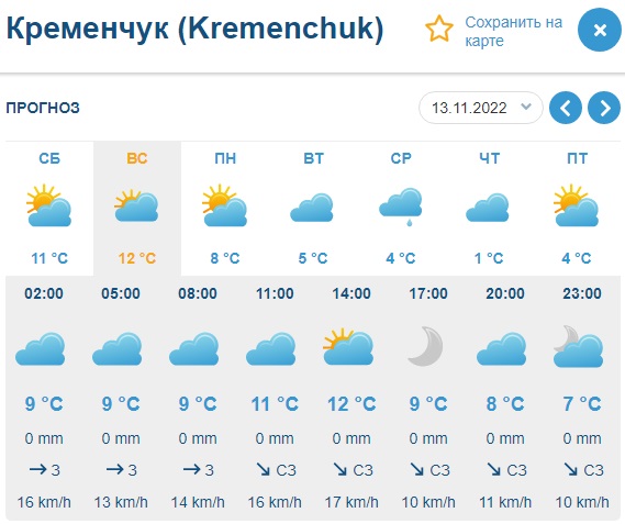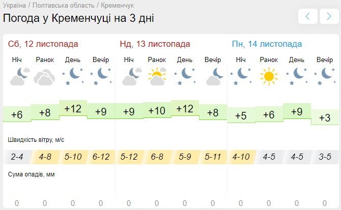 Не відрязняється від «колег» у своїх прогнозах Ventusky, анонсує мінливу хмарність та відсутність дощу у ці вихідні. Швидкість вітру становитиме до 17 км/год. Стовпчики термометрів покажуть від +6°С до +12°С.