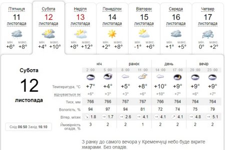 Подібний прогноз дає і Sinoptik. Під час вікенду сонце майже не вийде з-за хмар, але дощів не буде. Температурні показники коливатимуться у межах +4...+12°С.