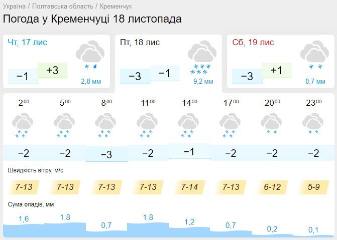 А от уже через тиждень, наступної п’ятниці, очікуємо густий сніг і -3°С. У Кременчук увірветься зима.