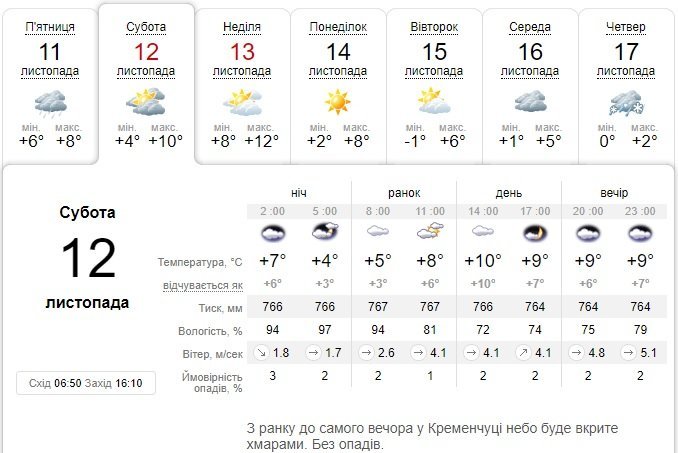 Подібний прогноз дає і Sinoptik. Під час вікенду сонце майже не вийде з-за хмар, але дощів не буде. Температурні показники коливатимуться у межах +4…+12°С.