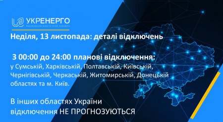 Сьогодні, 13 листопада, з 00:00 до 24:00 діятимуть планові відключення у м. Київ, Київській, Чернігівській, Черкаській, Житомирській, Сумській, Харківській, Полтавській та Донецькій областях, повідомляє Укренерго.