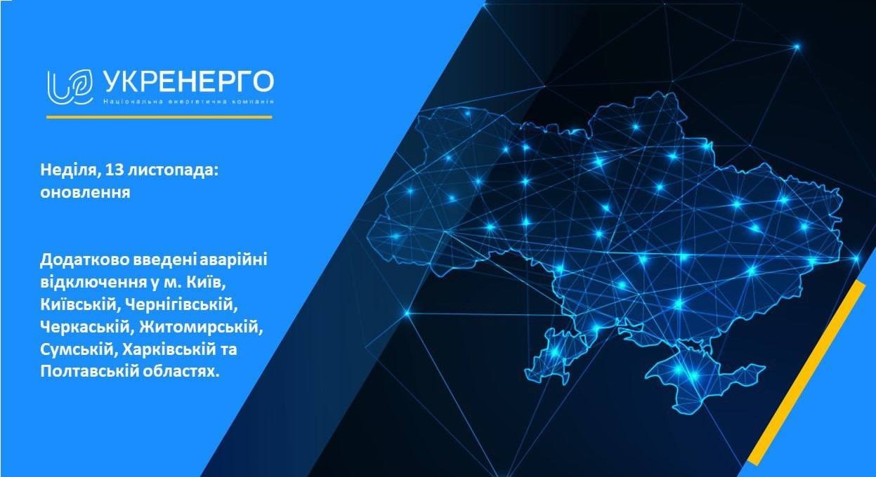 «Наразі, 13 листопада введені графіки аварійних відключень у м. Київ, Київській, Черкаській, Чернігівській, Житомирській та в Харківській, Полтавській і Сумській областях. Після стабілізації ситуації в цих областях продовжать діяти планові відключення», – йдеться у повідомленні. опублікованому близько 17 години.