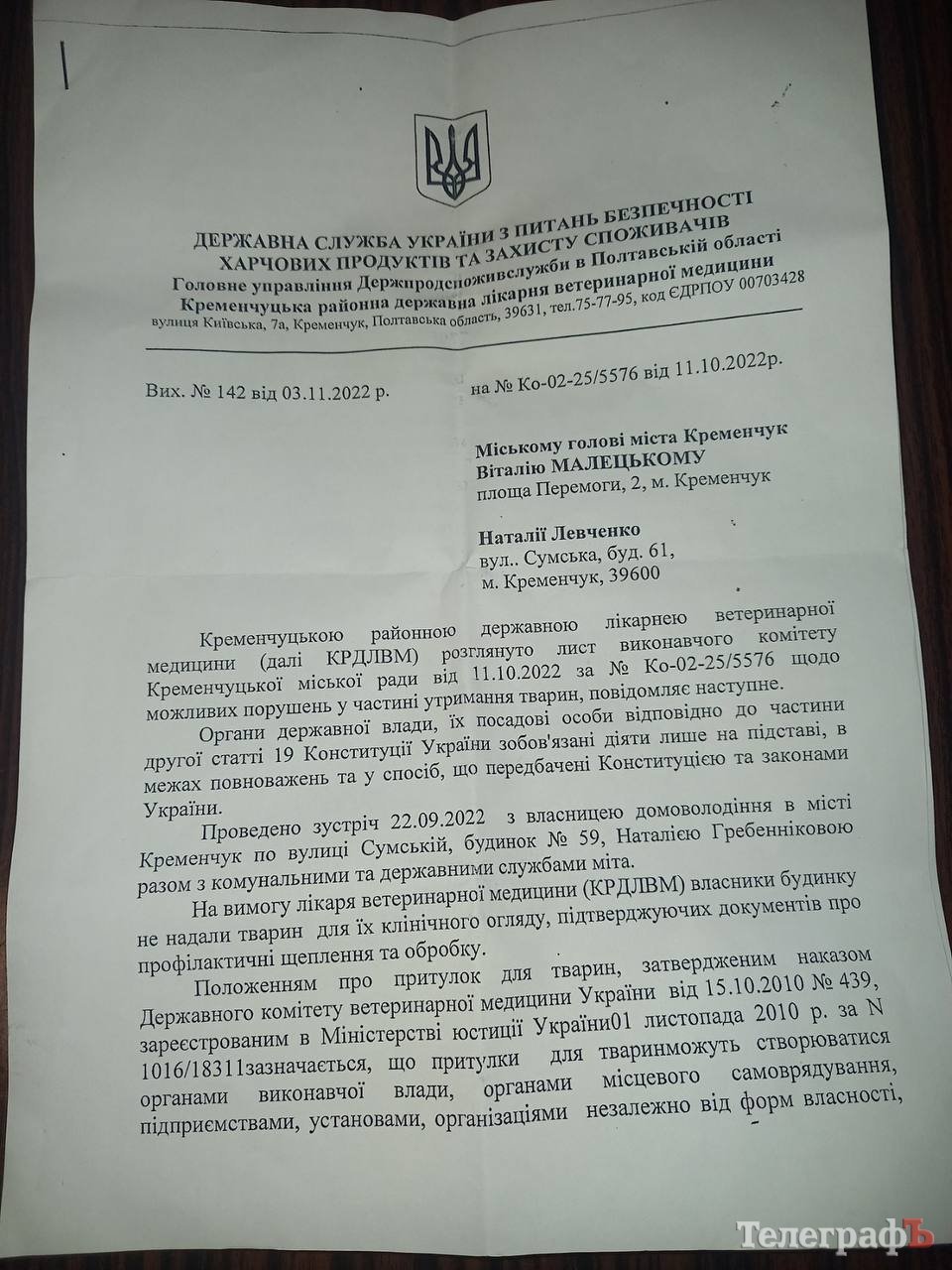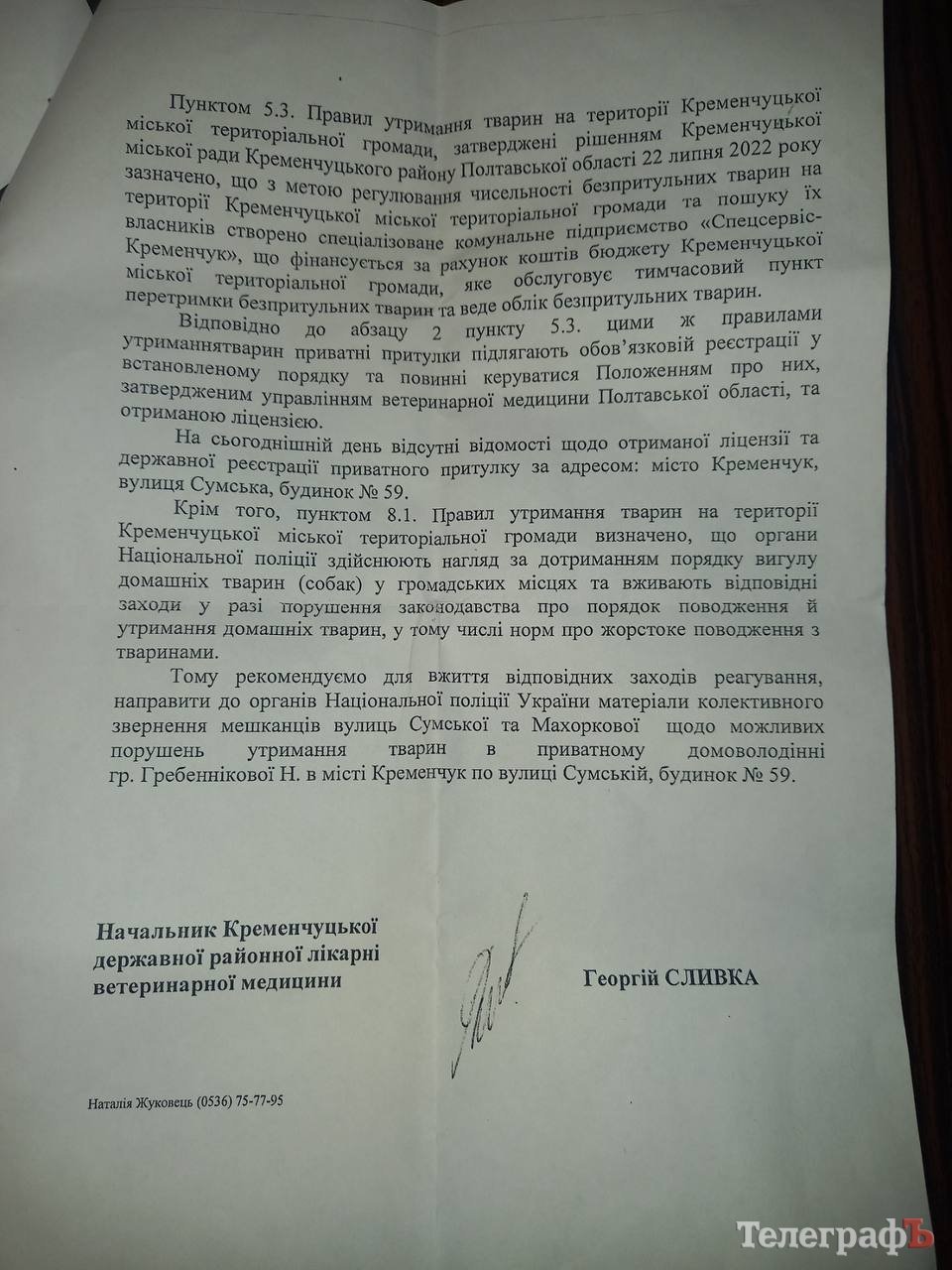 «Кременчуцький Телеграф» з власних джерел отримав лист начальника Кременчуцької державної районної лікарні ветеринарної медицини Георгія Сливки з відповіддю виконавчому комітету Кременчуцької міськради щодо притулку імені Гребеннікових.