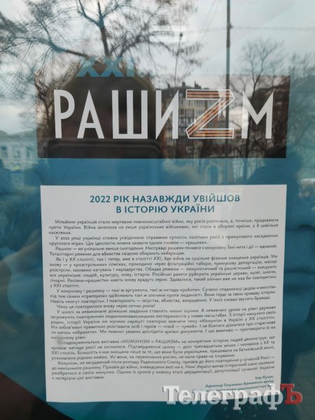 Виставка «Комунізм = рашизм» вперше була проекспонована у червні у Києві біля Михайлівського собору. Потім вона «подорожувала» Київщиною, Чернігівщиною, побувала у Черкасах, а на Полтавщині – у Полтаві та Миргороді. Виставка у нашому місті залишатиметься мінімум 2 тижні. А після Кременчука експонати поїдуть у Кропивницький.