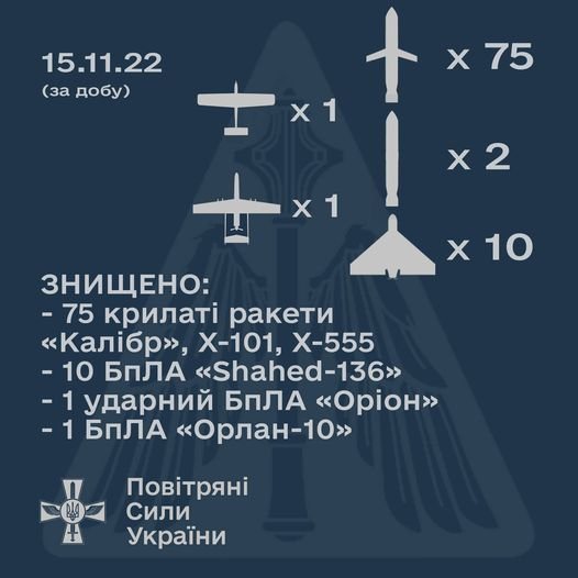 За уточненою інформацією вчора, 15-го листопада, окупанти атакували Україну 96 крилатими ракетами повітряного та морського базування (Х-101, Х-555, «Калібр»), а також керованими авіаційними ракетами Х-59, ударними дронами Shahed-136/131, «Оріон», «Орлан-10».