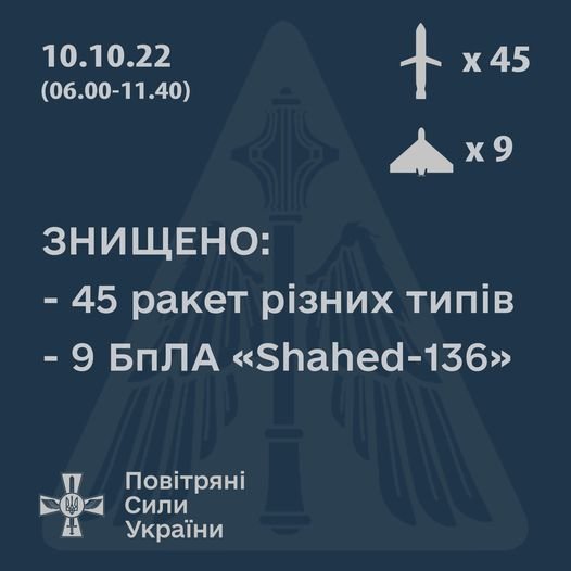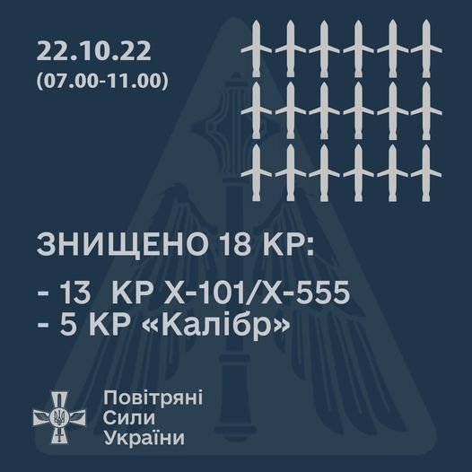 22-го жовтня ворог наніс черговий масований ракетний удар, використавши 33 крилаті ракети морського та повітряного базування (Х-555/101, «Калібр»). ППО ЗСУ вдалось знищити 18 ракет (майже 55%).