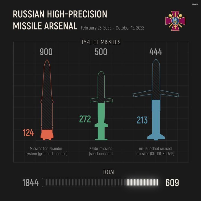 Зокрема, Міністр оборони України Олексій Резніков ще 14-го жовтня опублікував інфографіку з даними щодо російської зброї. За його інформацією, на той час на озброєнні в росії залишилось 609 високоточних ракет: