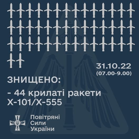 31-го жовтня росія випустила з літаків стратегічної авіації Ту-95/Ту-160 50 крилатих ракет Х-101/Х-555, з яких було перехоплено 44 (88%).