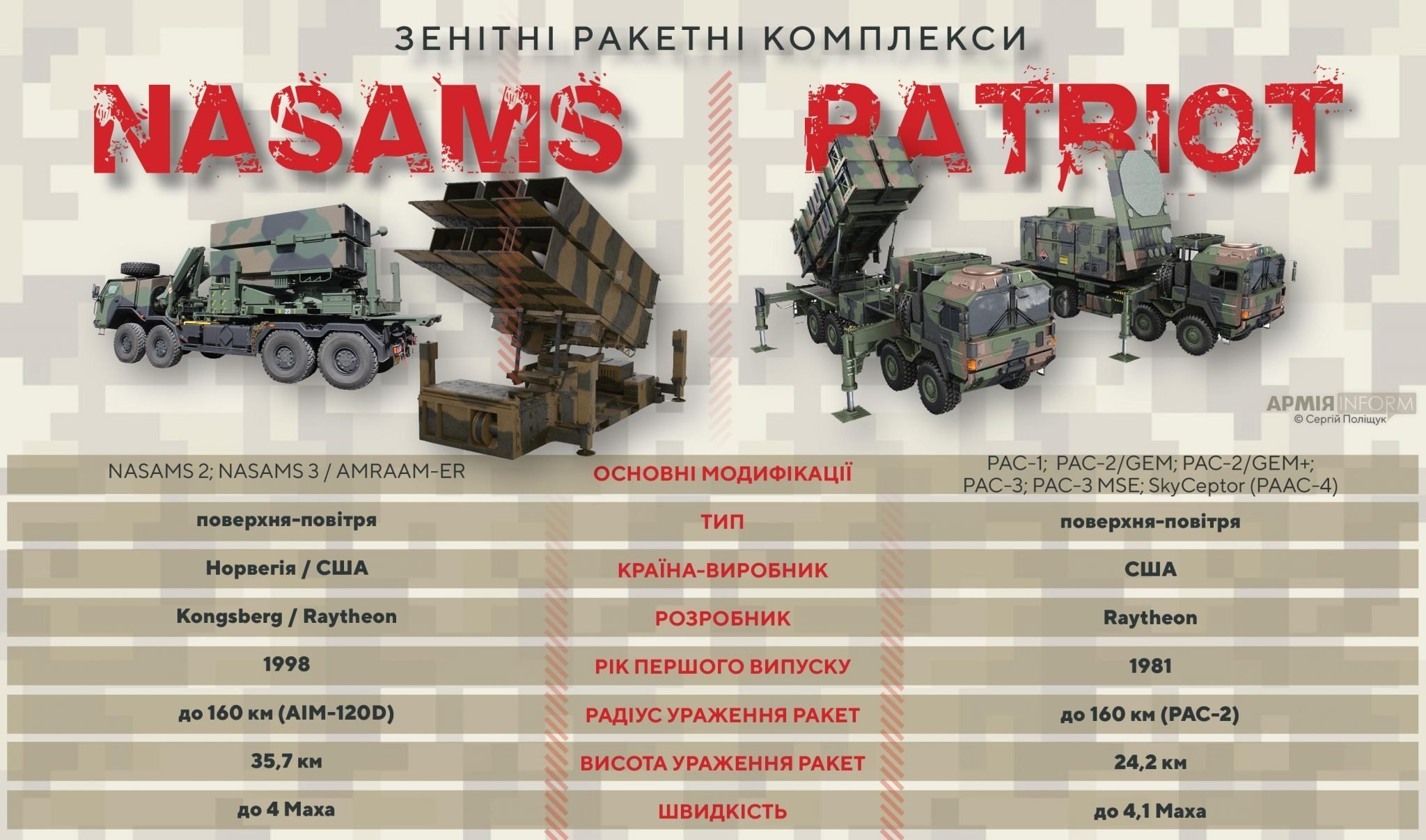 NASAMS — це зенітний ракетний комплекс (ЗРК) системи протиповітряної оборони, а Patriot — протиракетний ЗРК. Головна різниця між протиракетною та протиповітряною обороною, полягає в повітряних цілях, проти яких застосовуються ЗРК.