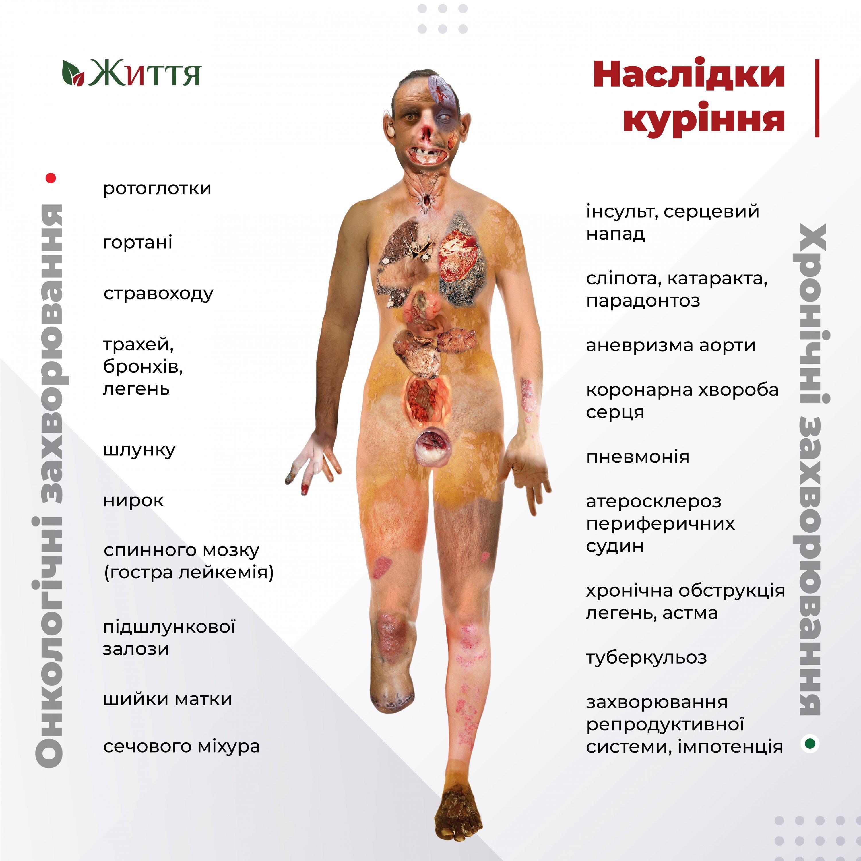 Тож як саме шкода тютюну позначається на організмі? Дим, який вдихається під час куріння, містить понад 7 000 хімічних сполук, з яких щонайменше 250 є токсичними. У значних кількостях ці речовини можуть призвести до хронічної перевтоми, підвищення артеріального тиску, ішемічної хвороби серця, інсульту, тромбозу, захворювань дихальних шляхів, імпотенції, безпліддя, раку.