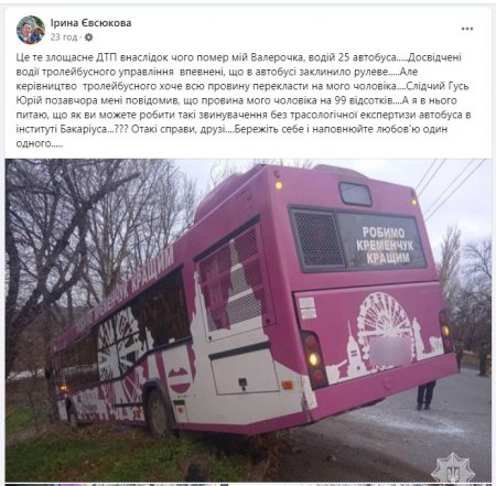 Дружина водія автобуса МАЗ (маршрут №25), загиблого у наслідок ДТП на Свіштовській 7 листопада, розповіла на своїй сторінці у соцмережі, що колеги її чоловіка впевнені у тому, що в автобуса «заклинило рульове». Проте, за словами жінки, керівництво КТУ хоче перекласти вину на її загиблого чоловіка. Тим більше слідчий у цій справі також повідомив їй, що 99% винен був водій автобуса.