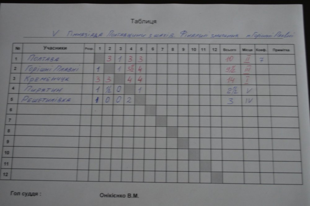 24 листопада у Горішніх Плавнях збірна команда Кременчука перемогла у фіналі V Гімназіаді Полтавщини з шахів. Здобули 14 очок з 16 можливих.