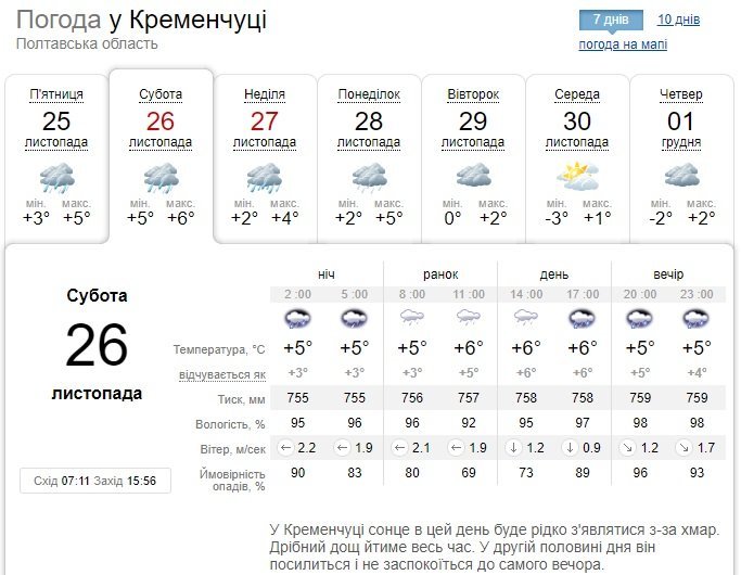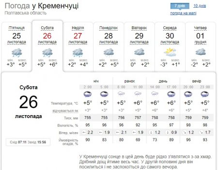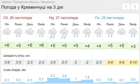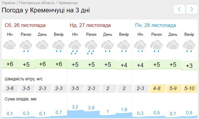 За прогнозом Sinoptik, дощ не вщухатиме протягом усіх вихідних, лише інколи йтиме з меншою силою. Лише ввечері у неділю, 27 листопада, опади візьмуть паузу. Стовпчики термометрів покажуть від +2°С до +6°С.