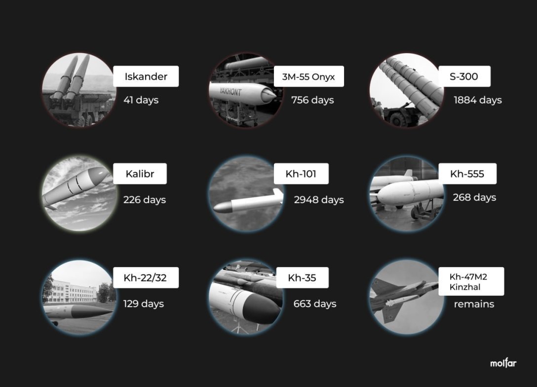 - гіперзвукова ракета Х-47М2 «Кинджал» — залишилося 43 одиниці (73% від загальної кількості).