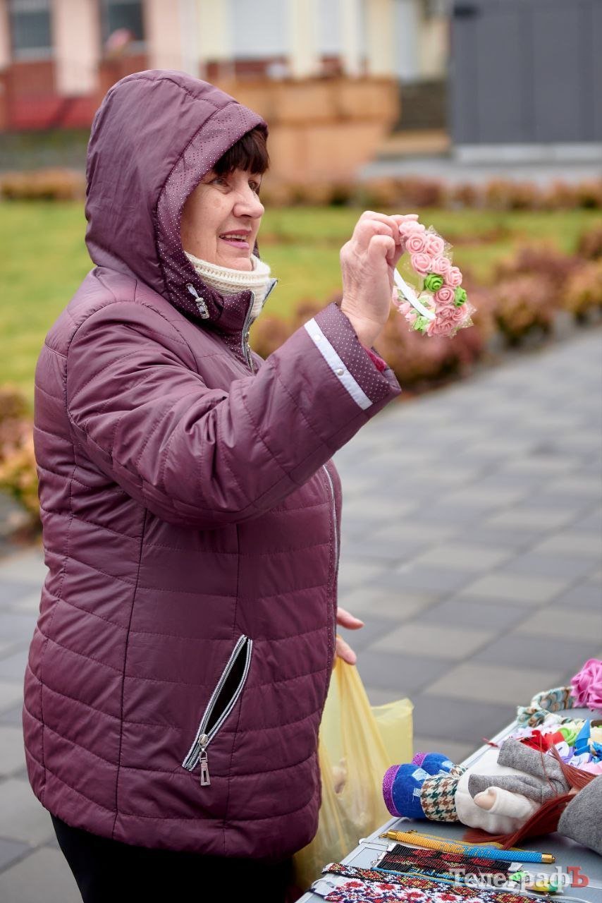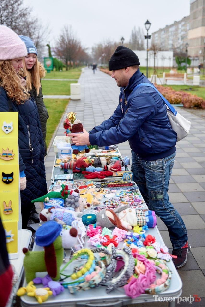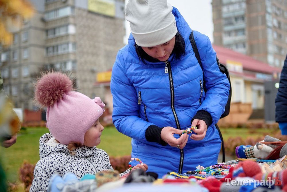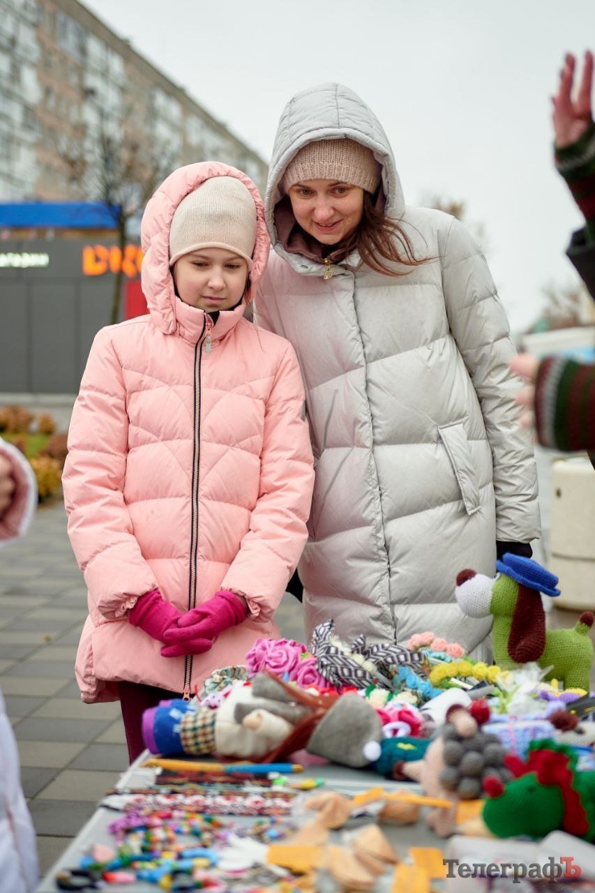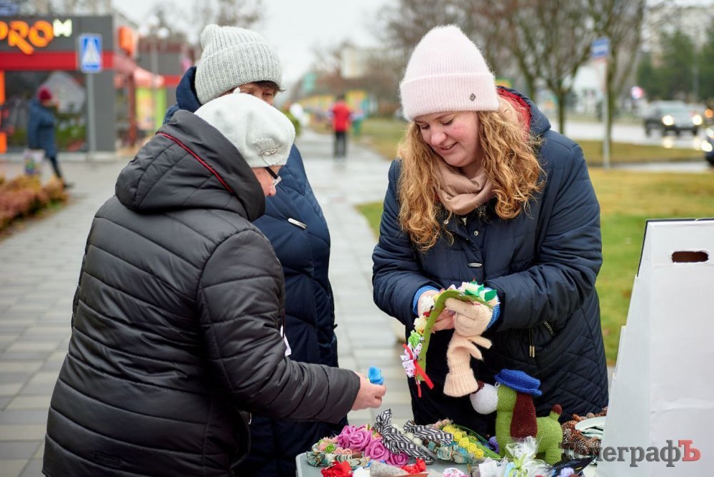 Продавали різдвяні вінки, крафтові свічки, брендовані товари з асортименту «Антрісолі», в’язані іграшки від вимушеної переселенки з Харкова, великі снігові баби від вимушеної переселенки зі Слов’янську, різні ялинкові іграшки від місцевих майстринь, листівки талановитого кременчуцького художника Сергія Брильова і не тільки.