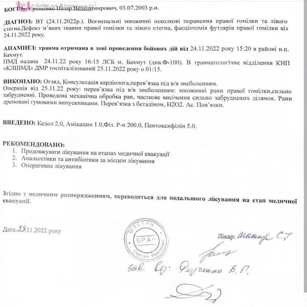 24 листопада під час обстрілу в районі Бахмута Назар отримав тяжкі множинні поранення ніг. Його екстрено прооперували у Дніпрі. Наразі кременчужанин перебуває у госпіталі в Києві.