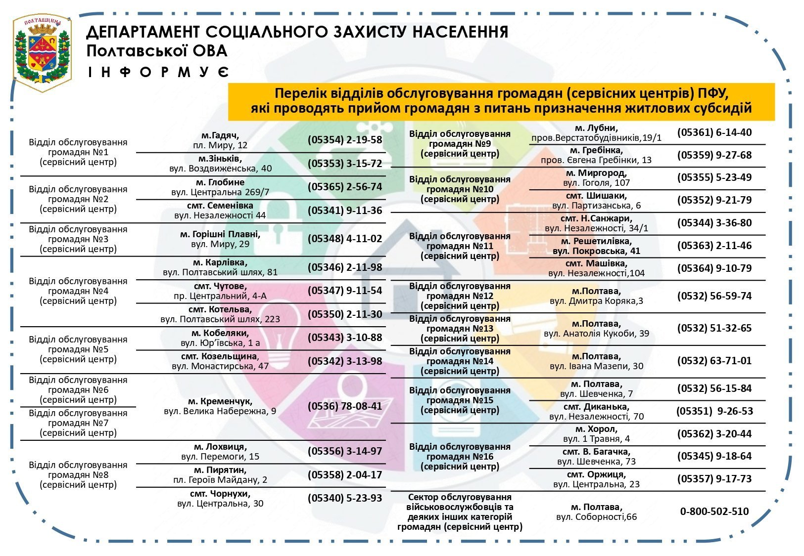Перелік відділів обслуговування громадян (сервісних центрів) Пенсійного фонду України у Кременчуцькому районі, які проводять прийом громадян з питань призначення житлових субсидій:
