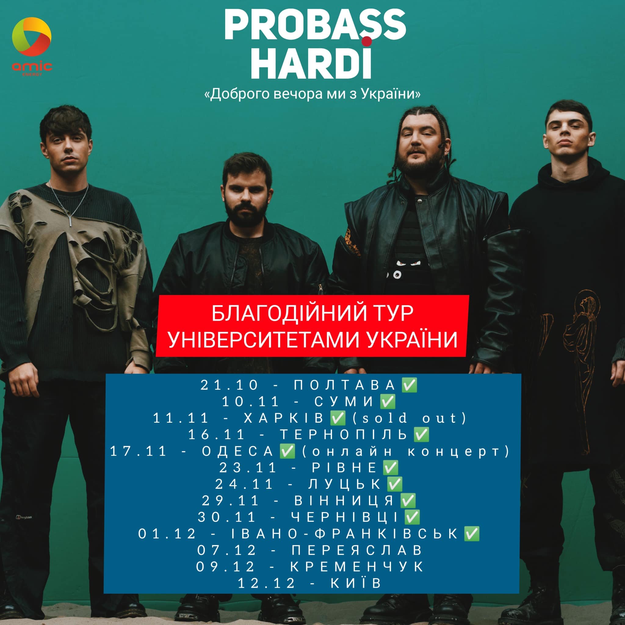 9 грудня у Кременчуцькому національному університеті ім.Михайла Остроградського виступить гурт Probass Hardi. Автори хіта «Доброго вечора, ми з України» виступатимуть в рамках благодійного туру університетами України.