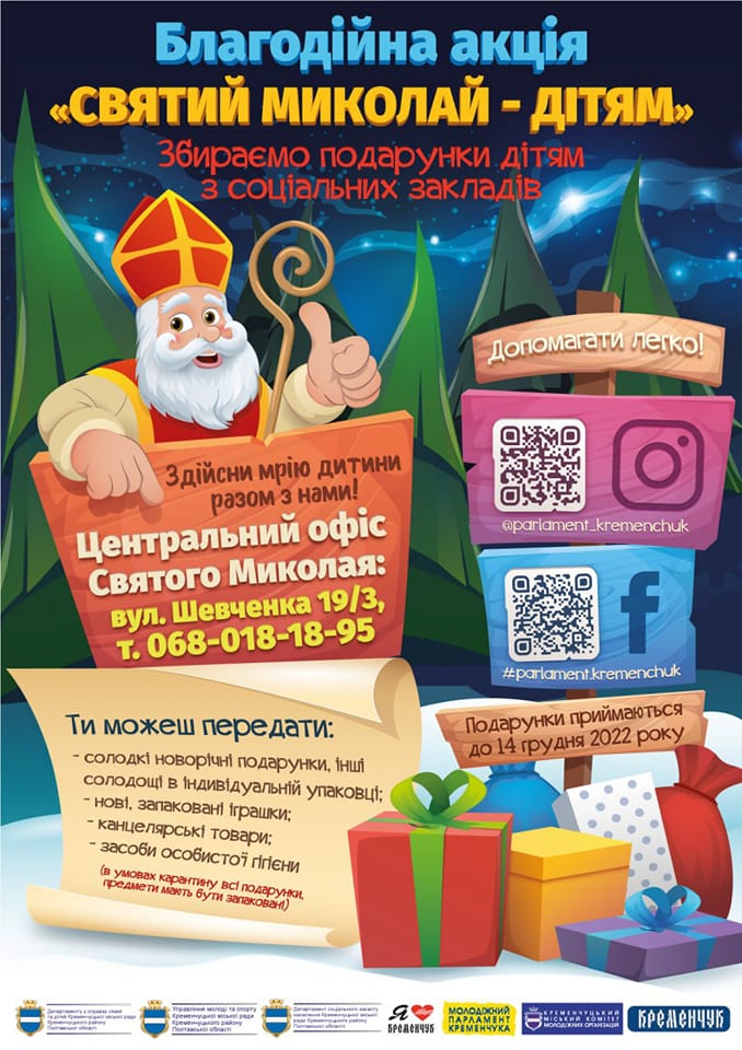 За даними пресслужби мерії, ця акція проводиться у нашому місті молодіжним парламентом Кременчука близько 20 років поспіль. Завдяки їй діти, що мають пільгові статуси або опинилися у складних життєвих обставинах і потребують соціальної уваги та підтримки, отримують омріяні подарунки та солодощі на День Святого Миколая.