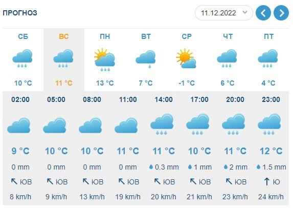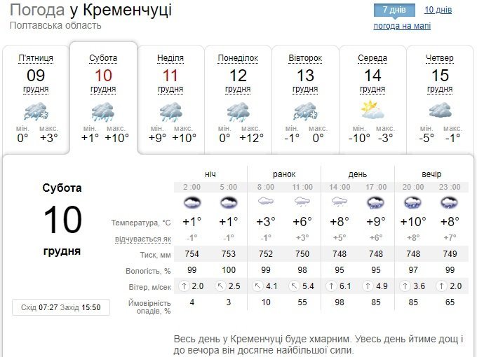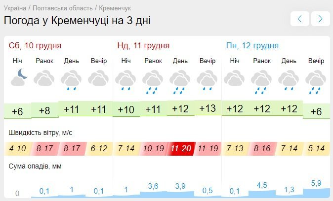За даними Gismeteo, у суботу, 10 грудня, у місті йтиме невеликий дощ, який у неділю, 11 грудня, перетвориться на зливу. До того ж у неділю кременчужан буквально «здуватиме» на вулицях, бо сила вітру сягне 20 м/с. У місті значно потепліє – до +13°С вдень.