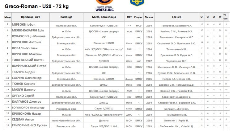 Чемпіоном України у ваговій категорії до 72 кг став представник Кременчука Ірфан Мірзоєв. Кримський татарин виступав за підтримки тренерів Анатолія Коханевича та Ленура Темірова. Зауважимо, що кілька років тому спортсмен представляв тимчасово анексований Крим, а наразі захищає кольори України, навіть став бронзовм призером чемпіонату світу до 20 років.