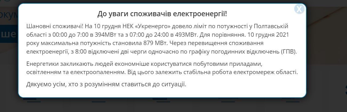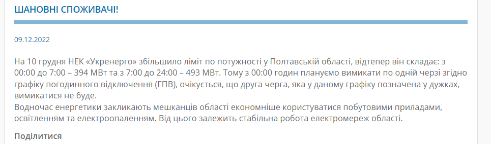 Як повідомляє АТ «Полтаваобленерго», на 10 грудня НЕК «Укренерго» довело ліміт по потужності у Полтавській області з 00.00 до 7.00 в 394МВт та з 07.00 до 24.00 в 493МВт. Відтак із 8.00 відключатимуть дві черги одночасно по графіку погодинних відключень.