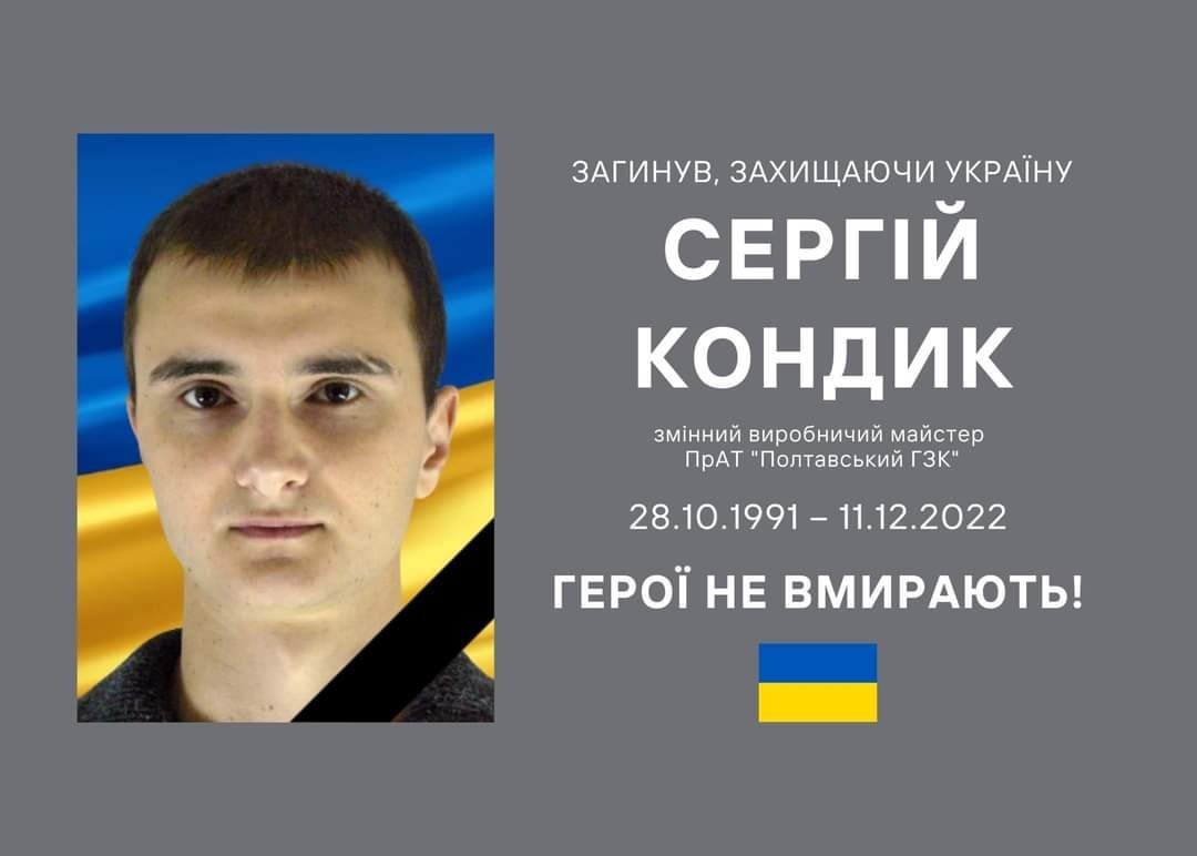 У бою за Україну загинув випускник Кременчуцького національного університету, працівник Полтавського ГЗК Сергій Кондик. Захисник загинув 11 грудня на Луганщині.