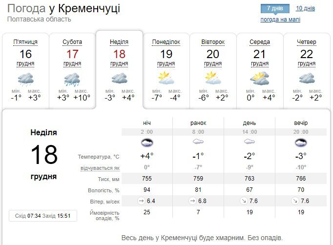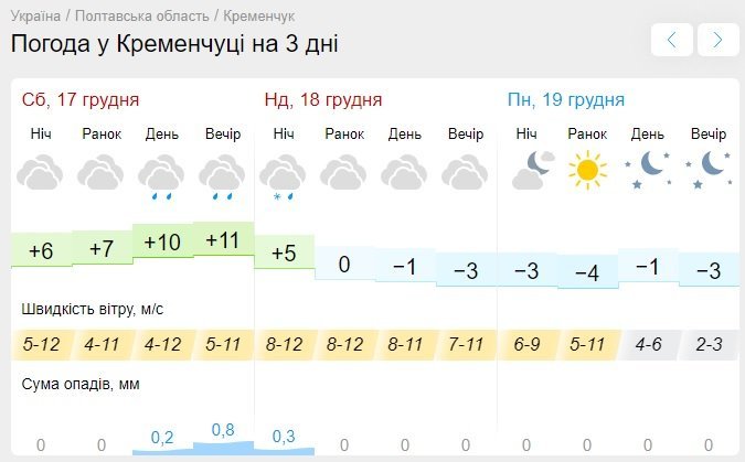 Gismeteo прогнозує, що у суботу, 17 грудня, вдень температура підніметься до +11°С, а ввечері підуть дощі. У неділю, 18 грудня, температура впаде до -3°С, понеділок також пройде з мінусовими показниками.