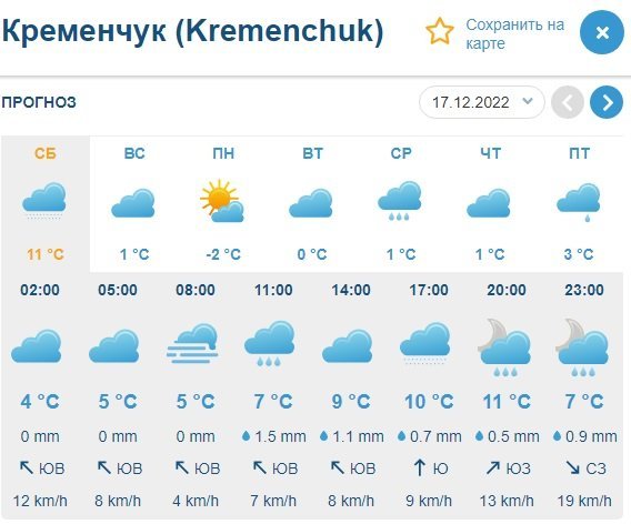 Ventusky обіцяє, що ввечері у суботу у Кременчуці буде тепло, +11°С, але мокро. У неділю стане холодно – до -2°С. Крім того, у неділю ще й підніметься вітер – до 24 км/год.