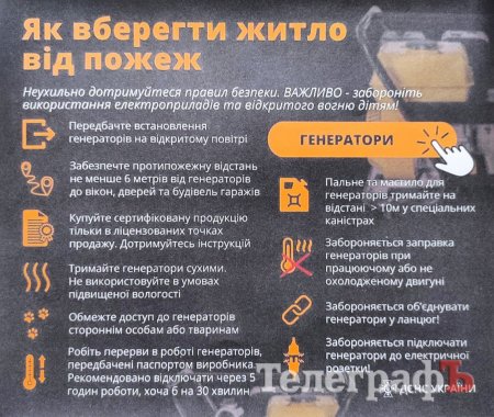 У зв'язку з цим, у Кременчуцькому РУ ГУ ДСНС у Полтавській області наголосили на важливості дотримання правил безпеки при використанні генераторів, оскільки пересувні електростанції є джерелом підвищеної небезпеки.