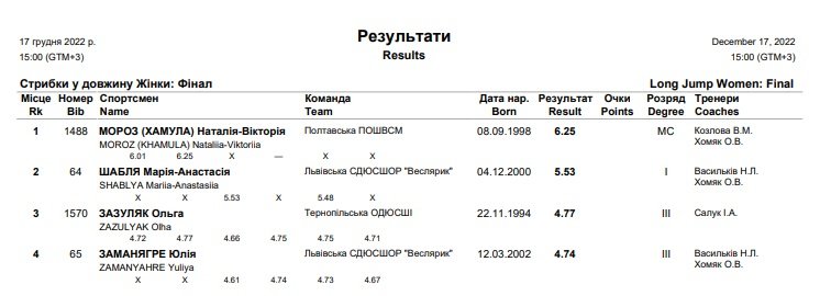 16-17 грудня у Львові відбувся традиційний «Новорічний День стрибуна». «Скіф» зібрав атлетів вікових категорій U16, U18, U20, U23 та дорослих. Кременчужанка Наталія-Вікторія Мороз (Хамула) стала чемпіонкою у стрибках у довжину. Вона показала результат 6,25 м.