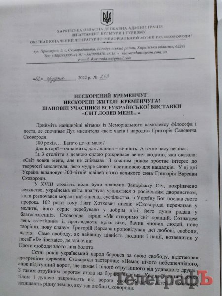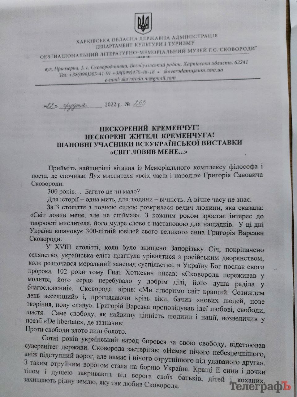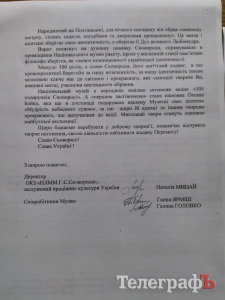 Директорка музею надіслала до Кременчука листа: