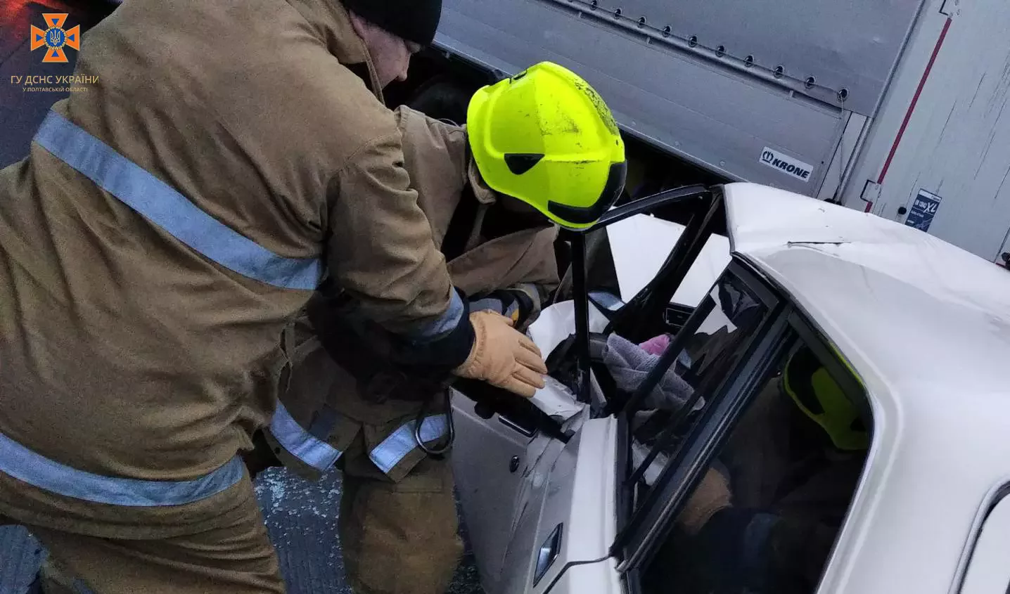 Як повідомили у Головному управлінні ДСНС України у Полтавській області, внаслідок зіткнення легкового та вантажного автомобілів, водій та пасажир легкового автомобіля отримали травми.