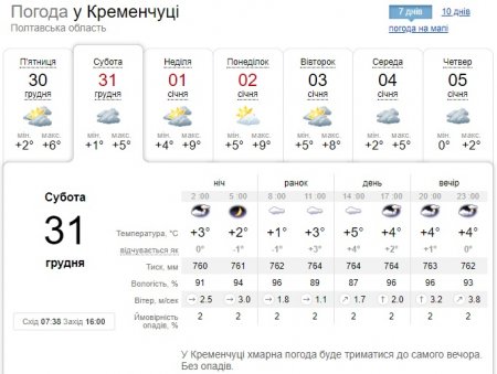 Ventusky обіцяє сонячні години з 11.00 до 14.00 у суботу, а далі протягом усього вікенду у місті буде хмарно. Температурні показники коливатимуться у межах +1...+10°С. Вранці у неділю, 1 січня, можливий невеликий дощ, а також вітер до 13 км/год увесь день.