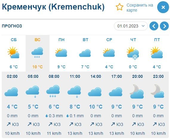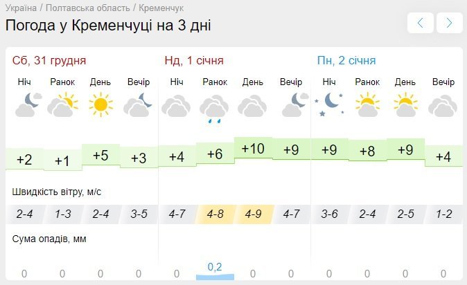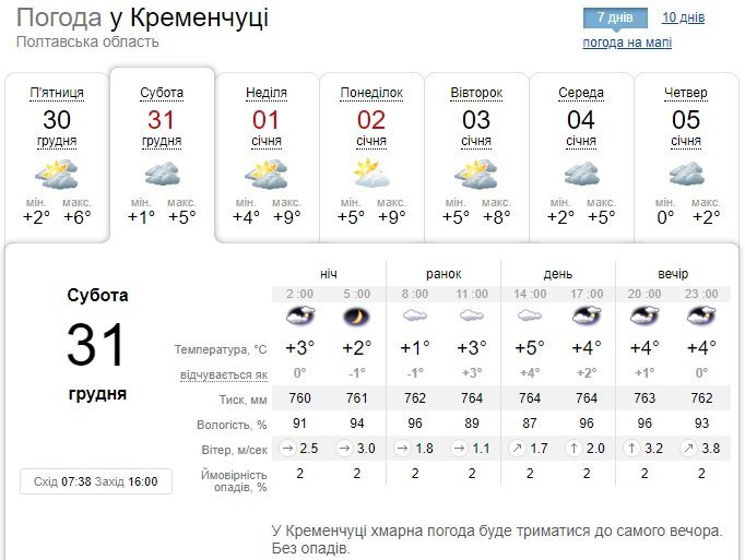 Ventusky обіцяє сонячні години з 11.00 до 14.00 у суботу, а далі протягом усього вікенду у місті буде хмарно. Температурні показники коливатимуться у межах +1…+10°С. Вранці у неділю, 1 січня, можливий невеликий дощ, а також вітер до 13 км/год увесь день.