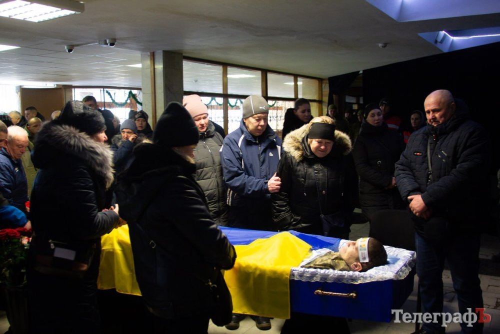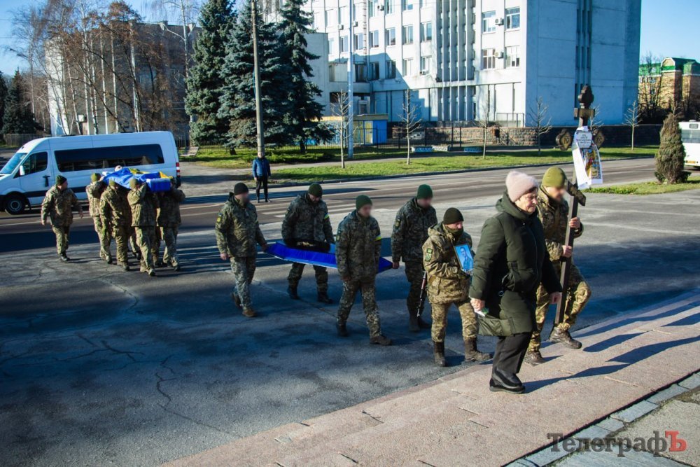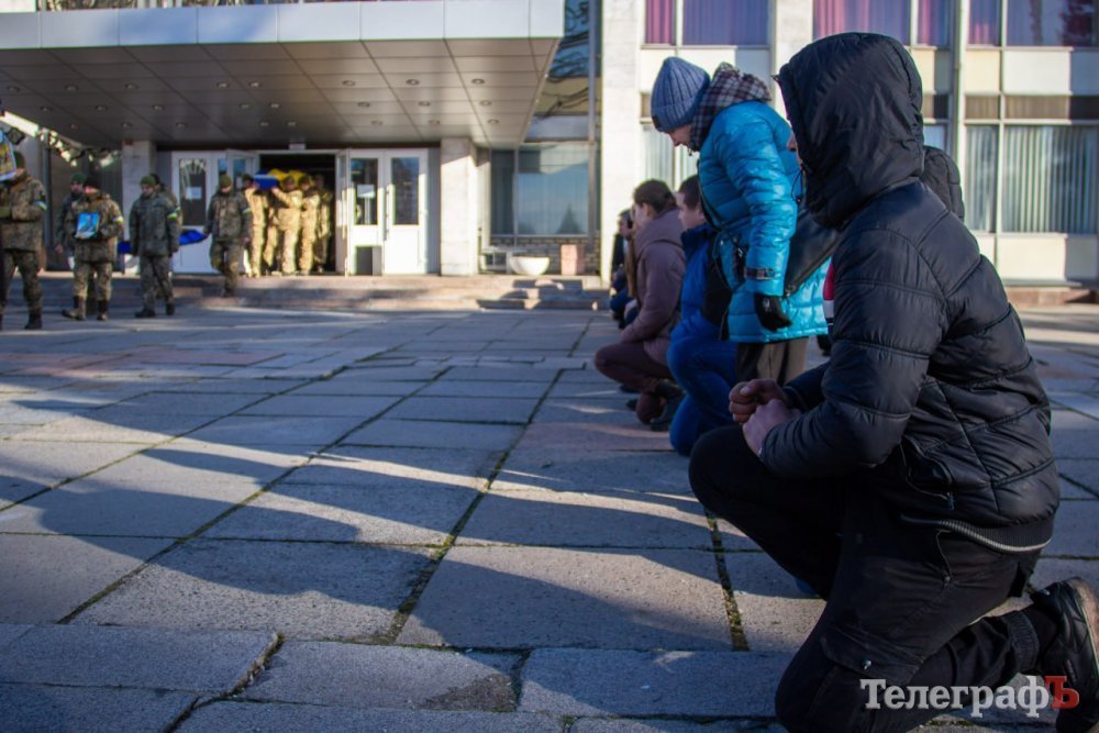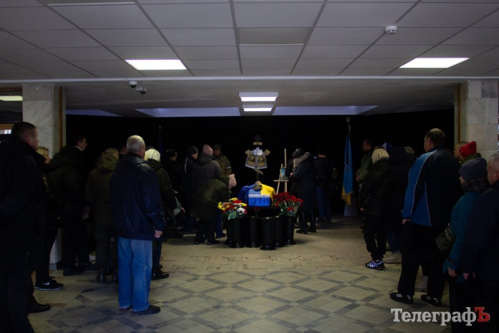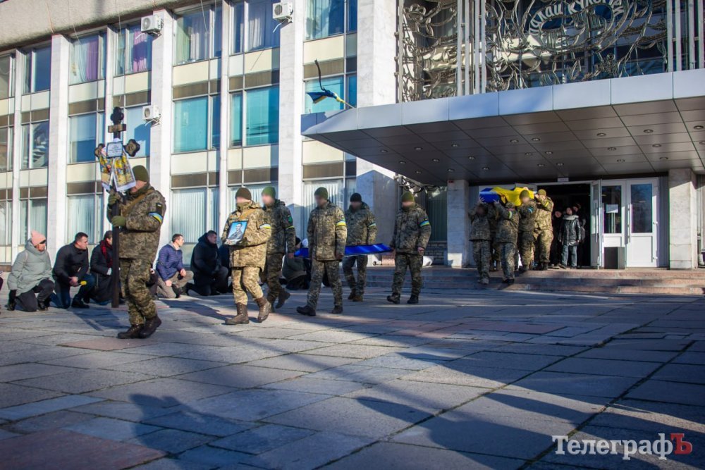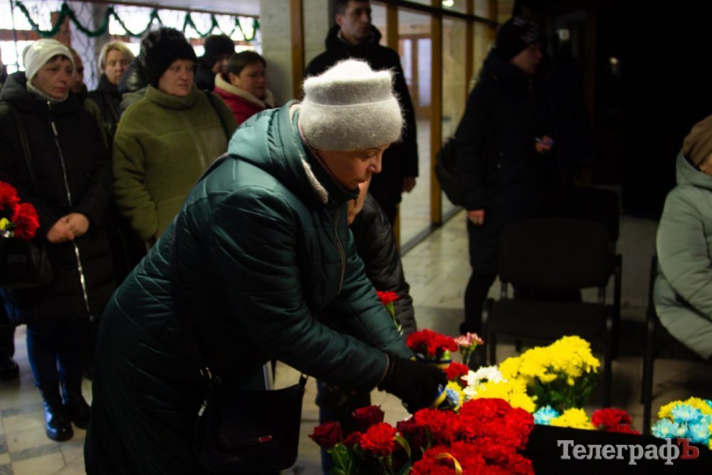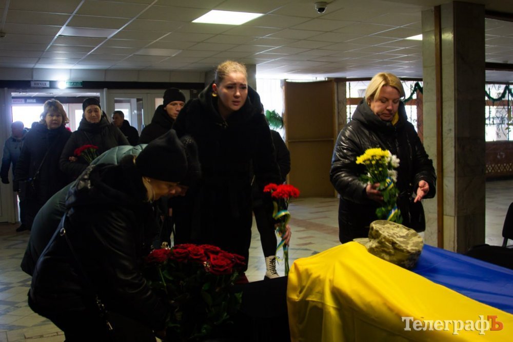 Кременчужани підносили квіти, щоб віддати шану загиблому захиснику України. Й вишукувалися живим коридором, схилившись на одне коліно, коли з Міського палацу культури виносили домовину огорнути синьо-жовтим державним стягом.