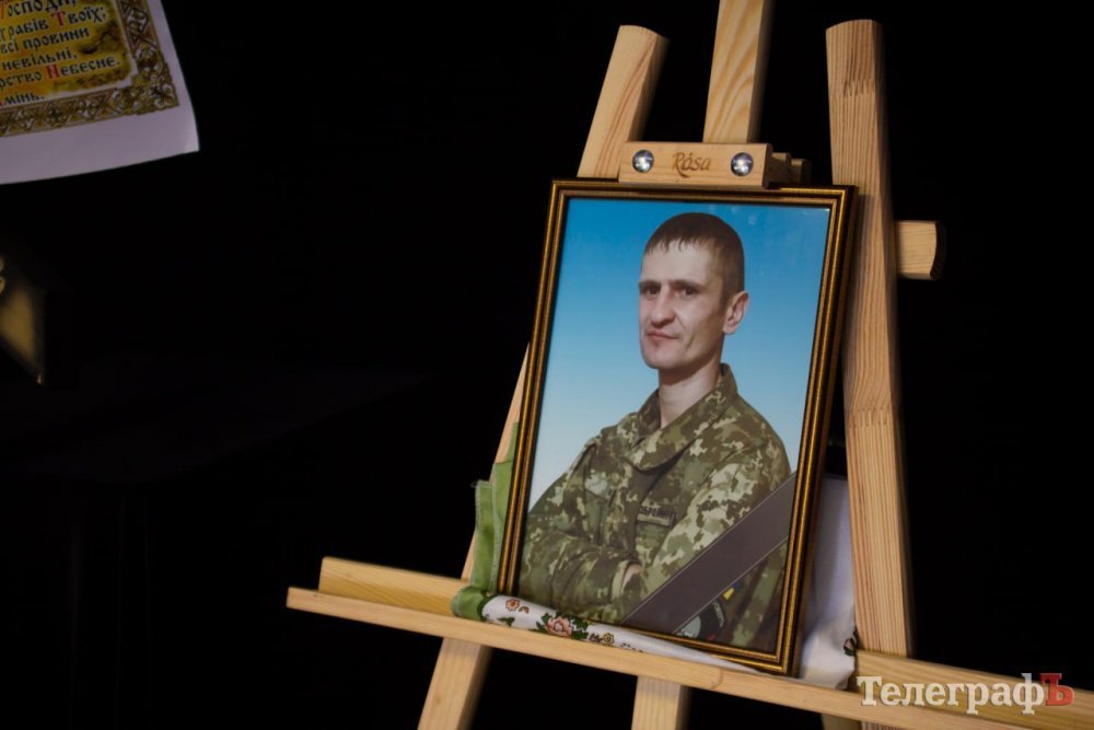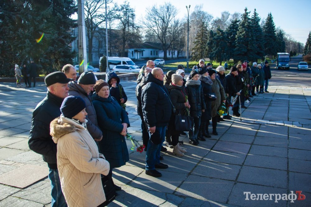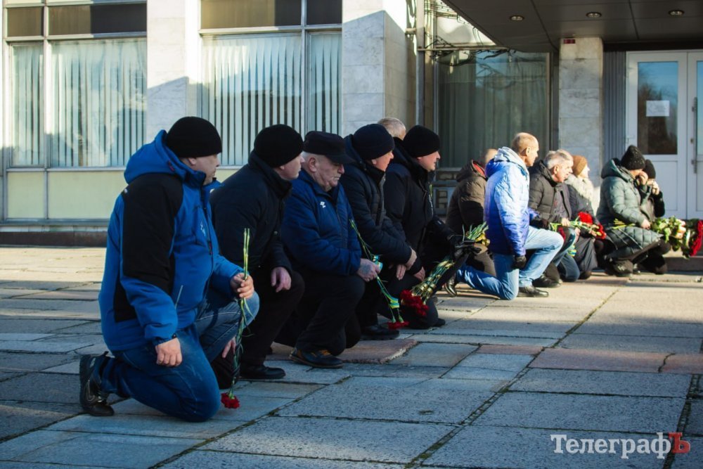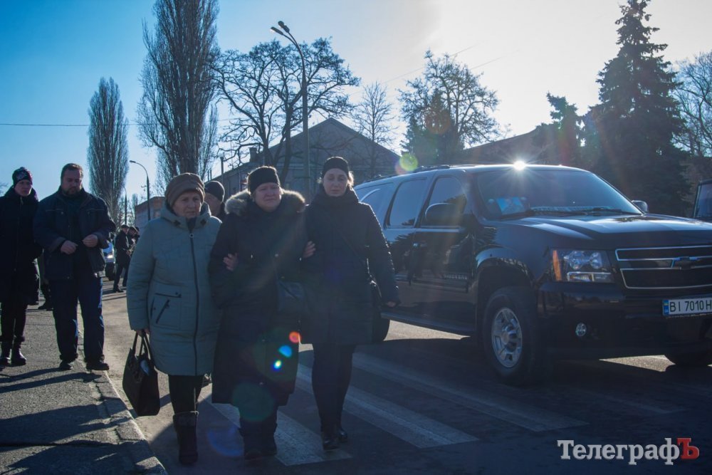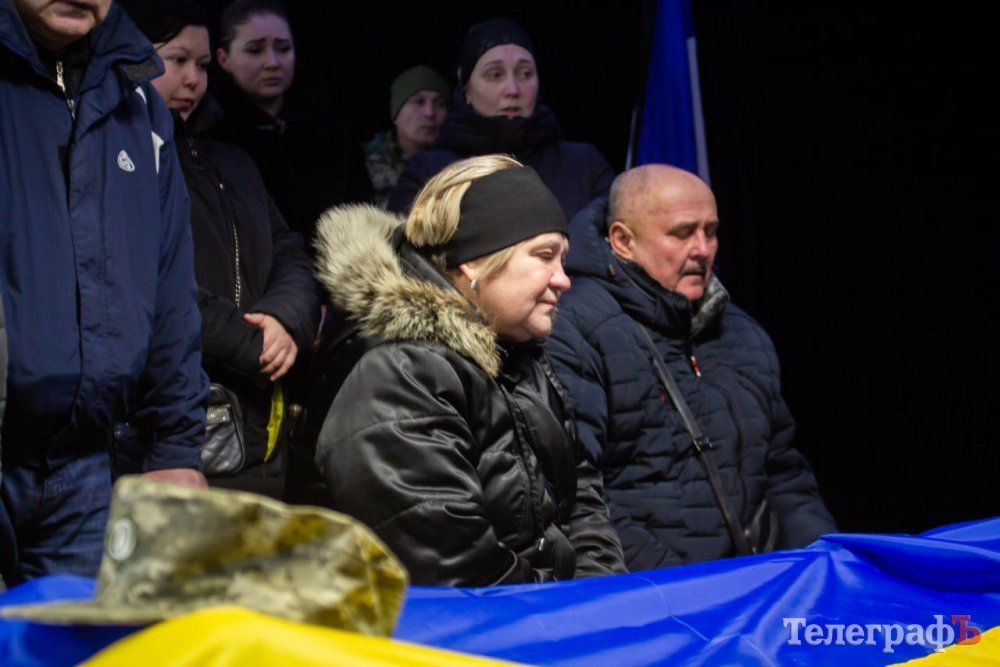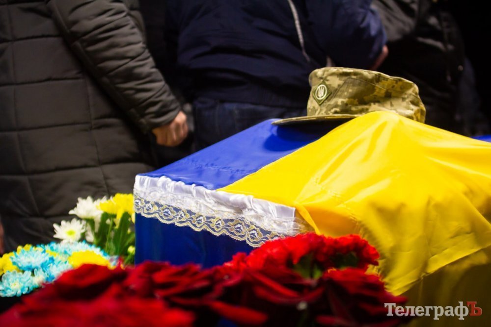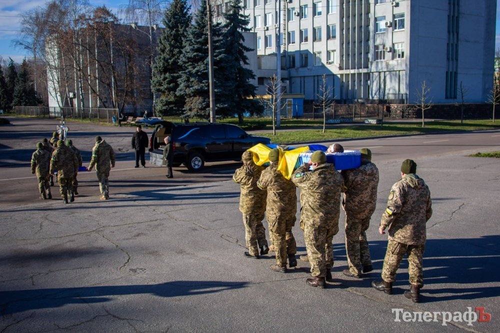 Кременчужани підносили квіти, щоб віддати шану загиблому захиснику України. Й вишукувалися живим коридором, схилившись на одне коліно, коли з Міського палацу культури виносили домовину огорнути синьо-жовтим державним стягом.
