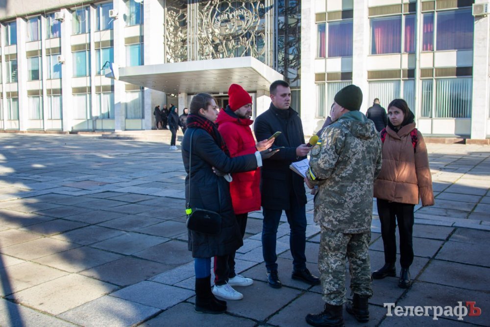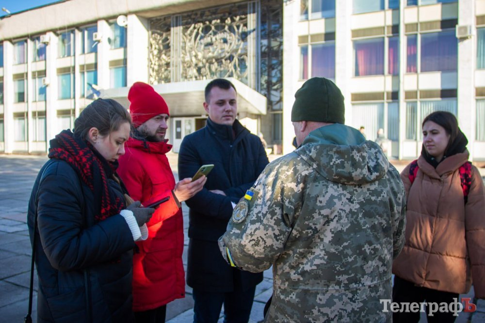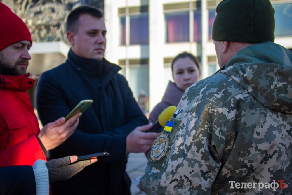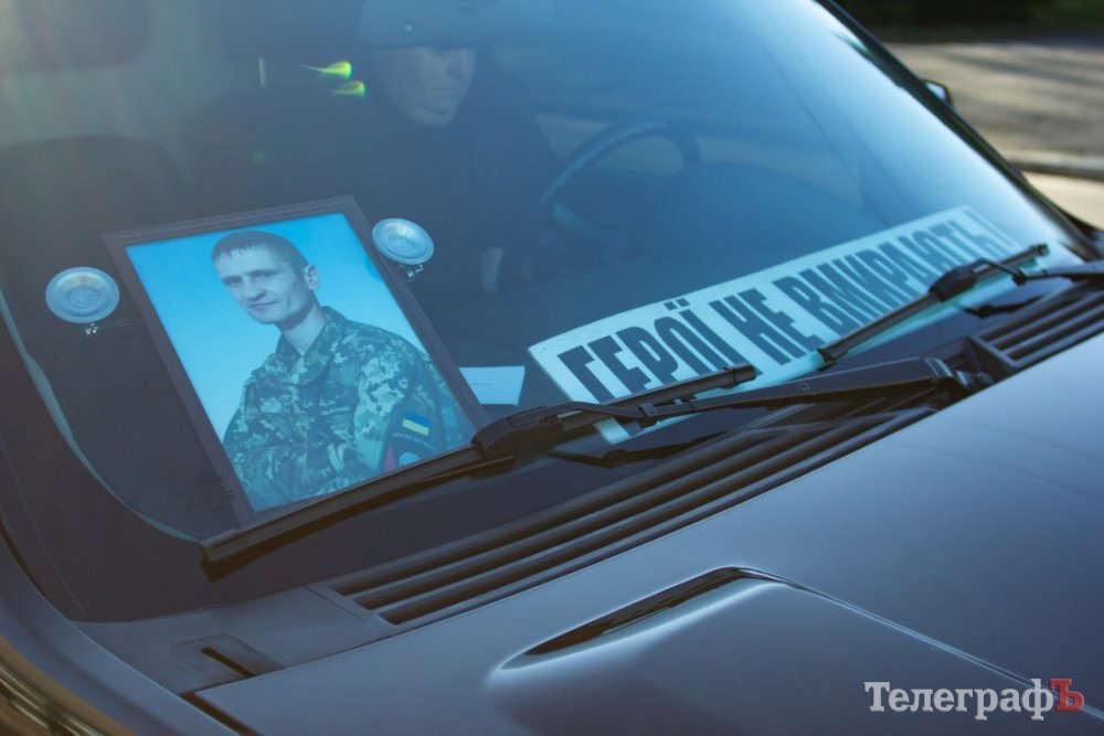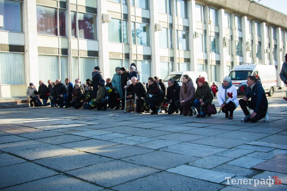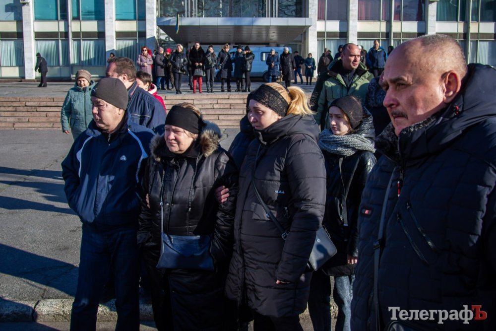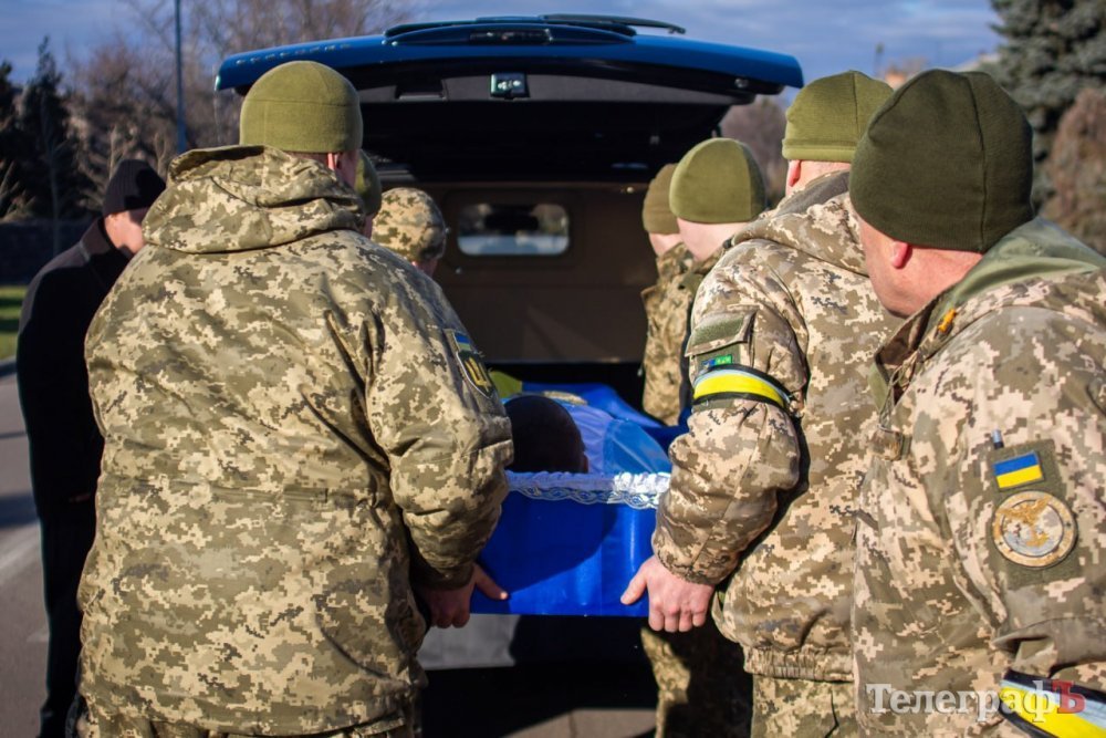 Кременчужани підносили квіти, щоб віддати шану загиблому захиснику України. Й вишукувалися живим коридором, схилившись на одне коліно, коли з Міського палацу культури виносили домовину огорнути синьо-жовтим державним стягом.