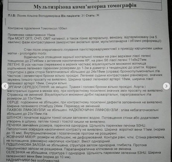 — Завжди важко просити, тим паче у такий час. Але я дуже сподіваюся на вашу чуйність. Близька мені людина, сестричка @pro_ku_ror потребує вашої підтримки. У 2020 році Альоні діагностували онкозахворювання — карциному шийки матки. З цього приводу була зроблена операція пангістероваріумектомія. Вона пройшла 4 курси хімієтерапії та досягла ремісії. Але нещодавно Альона відчула себе зле і її відправили на КТ, де ми дізналися, що стався рецидив. Наразі це метастази в плеврі, канцероматоз легень, надключична, заочеревинна та медіастинальна лімфаденопатія. Альонка мама двох діток, дружина бійця АТО, волонтер. Дуже багато зробила для наших воїнів. Час допомогти їй. Вірю в те, що з вашою допомогою ми впораємося, — написала подруга.