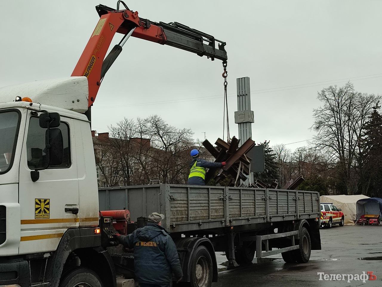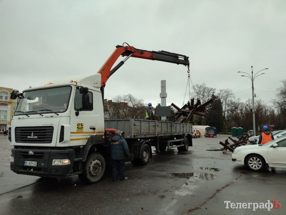 Сьогодні, 6-го січня, на площі Незалежності працівники КП «Міськсвітло» зранку почали прибирати протитанкові «їжаки». Загороджувальні конструкції автокраном підіймають та завантажують в автівки.