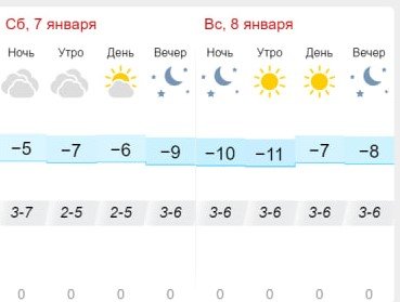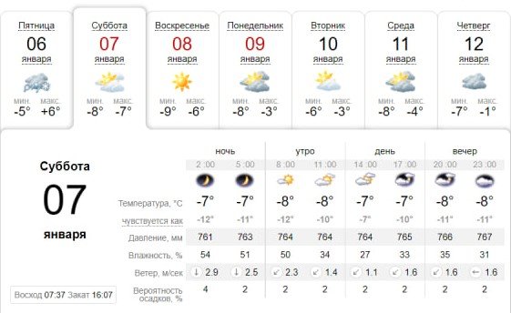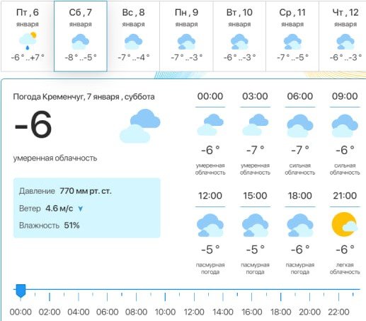 Meteo обіцяє хмарність на усі вихідні. Температурні показники коливатимуться у межах -4...-8°С. У суботу, 7 січня, вологість повітря складатиме 51%, а також очікується вітер до 4.6 м/с увесь день.