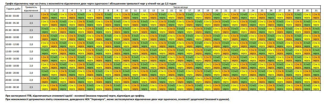 Із графіком відключень черг на січень (з можливістю відключення двох черг одночасно) можна ознайомитися за посиланням.
