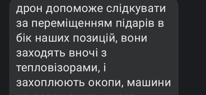 Нашим військовим на Бахмутському напрямку терміново необхідно купити квадрокоптер з тепловізором, який коштує 276 тисяч гривень. Про це на своїй фейсбук-сторінці повідомила волонтерка Ольга Назарова. Ціна питання – на фото (там же і скрін фрагменту переписки з бійцем).