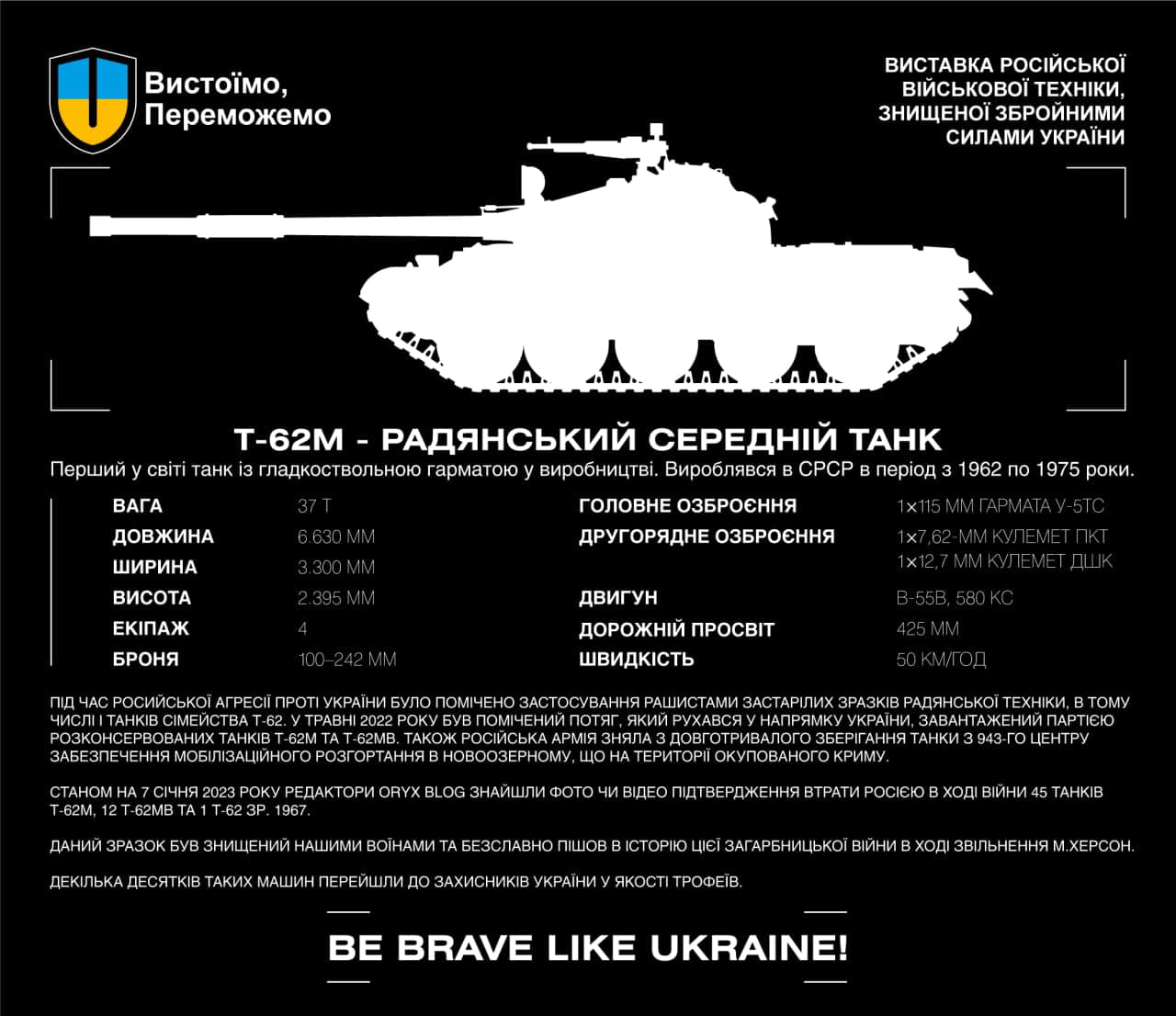 На цей раз площу Перемоги у Кременчуці прикрасив ще один воєнний експонат – російський танк Т-62М, підбитий під час звільнення Херсона. Цей танк належить до найстаріших зразків ворожої бронетехніки, яку рашисти змушені діставати зі своїх запасів, бо сучаснішу ЗСУ майже всю знищили!