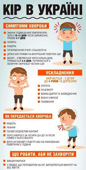 - Кір — це високоінфекційна хвороба, яка передається дуже швидко. Для інфікування не потрібен навіть безпосередній контакт із носієм вірусу. Достатньо опинитись у приміщенні, з якого нещодавно вийшла хвора людина. Друга небезпека кору в різноманітних ускладненнях: від запалення легень до запалення головного мозку. Особливо складно триває перебіг захворювання у маленьких дітей. Також кір небезпечний для вагітних жінок, бо загрожує втратою вагітності або порушеннями розвитку у плода.