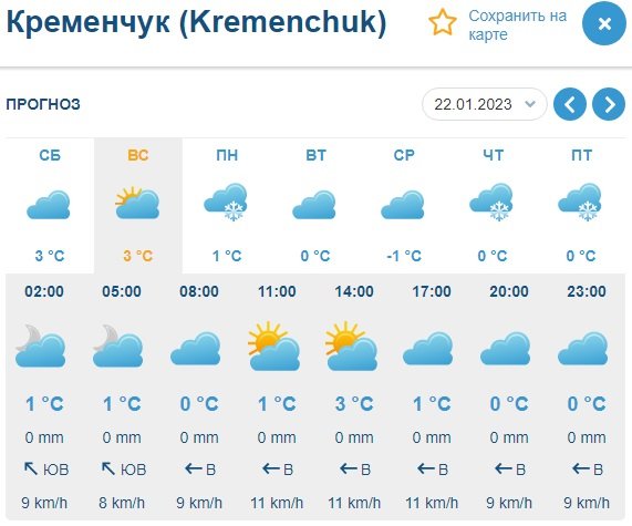 Sinoptik прогнозує мінливу хмарність у Кременчуці у цей вікенд, зате без опадів. Температура вночі впаде до 0°С, а вдень максимум «підскочить» до +5°С.
